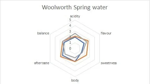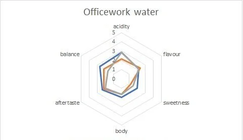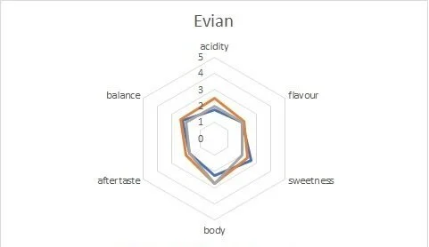 Officeworks aqua to go, Pureau, Evian and Woolworths spring water generally produce flatter cups across all coffee. Pure water also gives slightly more acidity, but very high quality while Evian and Woolworths spring water tend to produce a heavier cup.